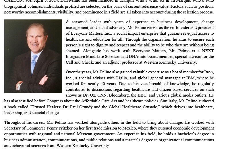 OAKTON, VA, April 3, 2024, Dan Pelino has been included in Marquis Who’s Who. As in all Marquis Who’s Who biographical volumes, individuals profiled are selected on the basis of current reference value. Factors such as position, noteworthy accomplishments, visibility, and prominence in a field are all taken into account during the selection process.
